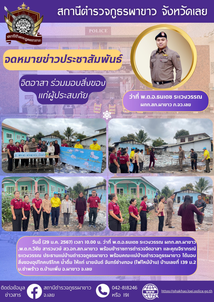 วันนี้ (29 ม.ค. 2567) เวลา 10.00 น. ว่าที่ พ.ต.อ.ธนเดช ระเวงวรรณ ผกก.สภ.ผาขาว ,พ.ต.ท.วิชัย สารวงวษ์ สว.อก.สภ.ผาขาว พร้อมข้าราชการตำรวจจิตอาสา และคุณจิราภรณ์ ระเวงวรรณ ประธานแม่บ้านตำรวจภูธรผาขาว พร้อมคณะแม่บ้านตำรวจภูธรผาขาว ได้มอบสิ่งของอุปโภคบริโภค น้ำดื่ม ให้แก่ นายนันต์ จันทร์ช่างทอง (ไฟไหม้บ้าน) บ้านเลขที่ 139 ม.2 บ.ซำพร้าว ต.บ้านเพิ่ม อ.ผาขาว จ.เลย