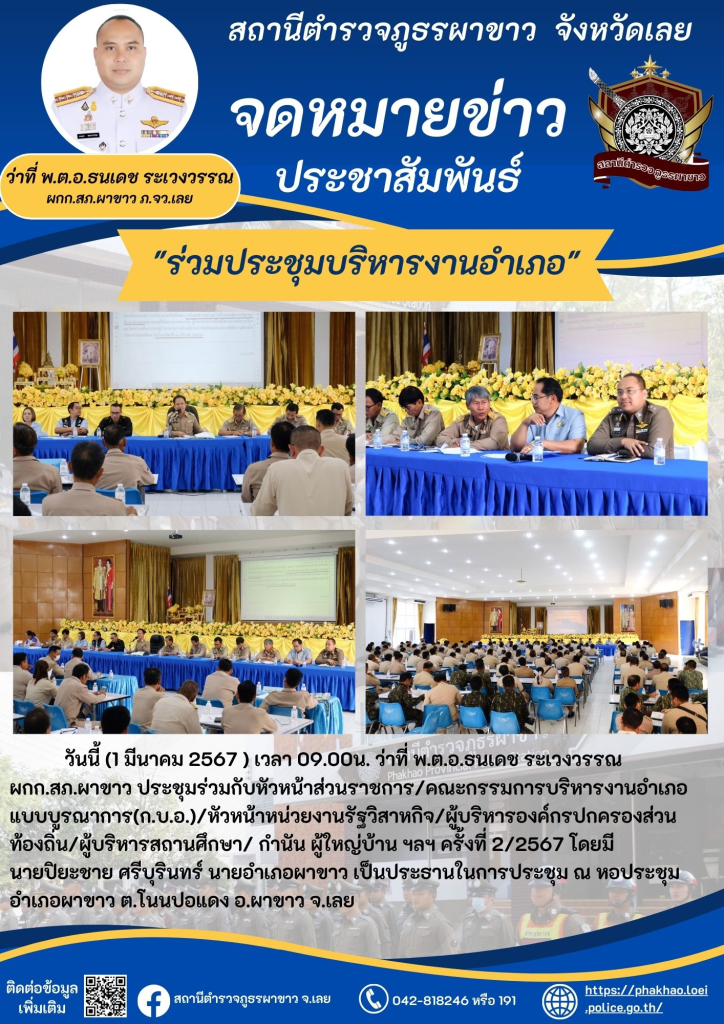 📌ประชุมร่วมกับ หัวหน้าส่วนราชการ/คณะกรรมการบริหารงานอำเภอแบบบูรณาการ(ก.บ.อ.)/หัวหน้าหน่วยงานรัฐวิสาหกิจ/ผู้บริหารองค์กรปกครองส่วนท้องถิ่น/ ผู้บริหารสถานศึกษา/ กำนัน ผู้ใหญ่บ้าน ฯลฯ ครั้งที่ 2/2567 โดยมีนายปิยะชาย ศรีบุรินทร์ นายอำเภอผาขาว เป็นประธานในการประชุม