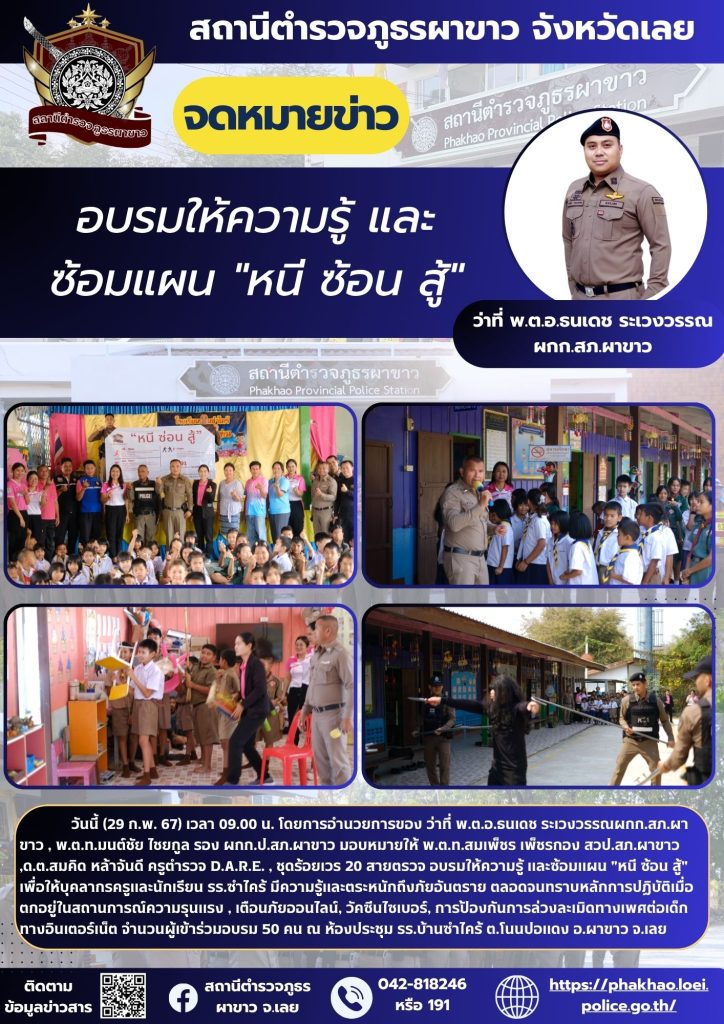 วันนี้ (29 ก.พ. 67) เวลา 09.00 น. โดยการอำนวยการของ ว่าที่ พ.ต.อ.ธนเดช ระเวงวรรณผกก.สภ.ผาขาว , พ.ต.ท.มนต์ชัย ไชยกูล รอง ผกก.ป.สภ.ผาขาว มอบหมายให้ พ.ต.ท.สมเพ็ชร เพ็ชรกอง สวป.สภ.ผาขาว ,ด.ต.สมคิด หล้าจันดี ครูตำรวจ D.A.R.E. ชุดร้อยเวร 20 สายตรวจ อบรมให้ความรู้ และซ้อมแผน “หนี ซ้อน สู้” เพื่อให้บุคลากรครูและนักเรียน รร.ซำไคร้ มีความรู้และตระหนักถึงภัยอันตราย ตลอดจนทราบหลักการปฏิบัติเมื่อตกอยู่ในสถานการณ์ความรุนแรง , เตือนภัยออนไลน์, วัคซีนไซเบอร์, การป้องกันการล่วงละเมิดทางเพศต่อเด็กทางอินเตอร์เน็ต จำนวนผู้เข้าร่วมอบรม 50 คน ณ ห้องประชุม รร.บ้านซำไคร้ ต.โนนปอแดง อ.ผาขาว จ.เลย