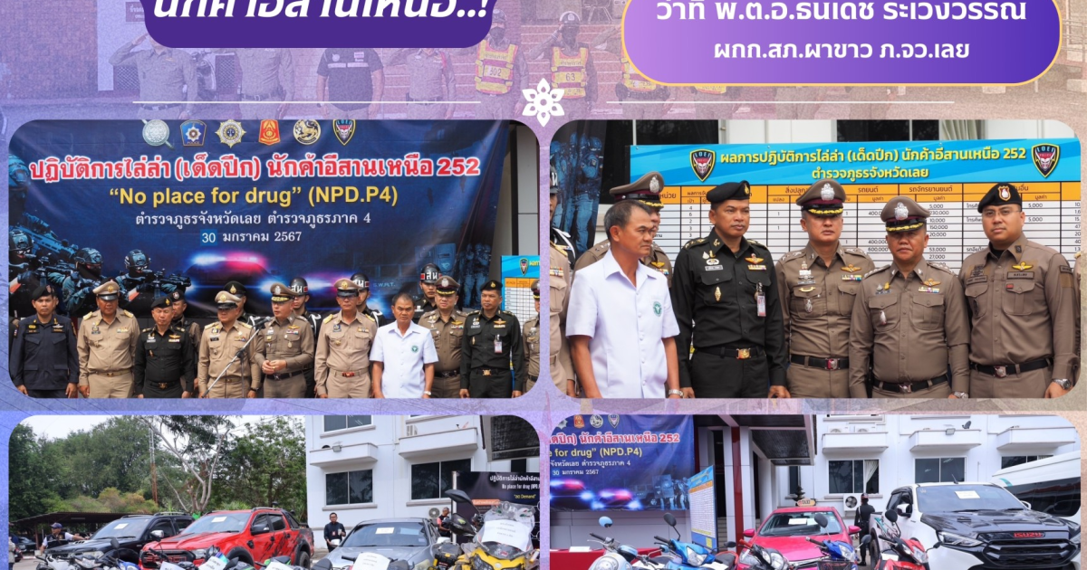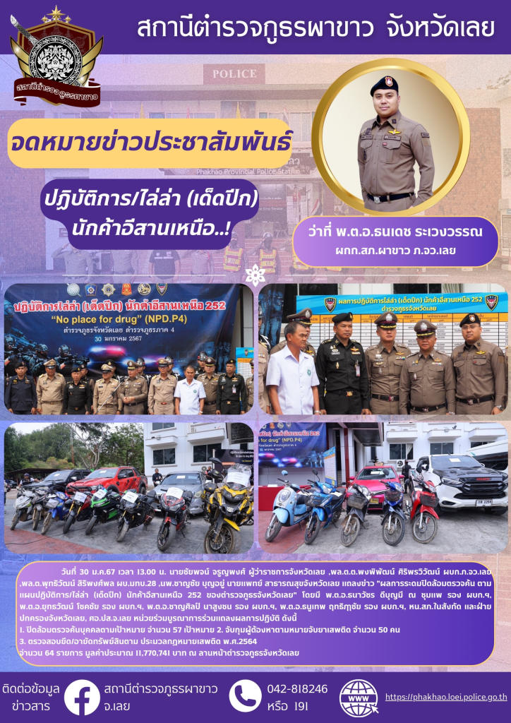 วันที่ 30 ม.ค.67 เวลา 13.00 น. นายชัยพจน์ จรูญพงศ์ ผู้ว่าราชการจังหวัดเลย ,พล.ต.ต.พงพิพัฒน์ ศิริพรวิวัฒน์ ผบก.ภ.จว.เลย ,พล.ต.พุทธิวัฒน์ สิริพงศ์พล ผบ.มทบ.28 ,นพ.ชาญชัย บุญอยู่ นายแพทย์ สาธารณสุขจังหวัดเลย แถลงข่าว “ผลการระดมปิดล้อมตรวจค้น ตามแผนปฏิบัติการ/ไล่ล่า (เด็ดปีก) นักค้าอีสานเหนือ 252 ของตำรวจภูธรจังหวัดเลย” โดยมี พ.ต.อ.ธนาวัชร ดีบุญมี ณ ชุมแพ รอง ผบก.ฯ, พ.ต.อ.ยุทธวัฒน์ โชคชัย รอง ผบก.ฯ, พ.ต.อ.ชาญศิลป์ นาสูงชน รอง ผบก.ฯ, พ.ต.อ.ธนูเทพ ฤทธิฦาชัย รอง ผบก.ฯ, หน.สภ.ในสังกัด และฝ่ายปกครองจังหวัดเลย, ศอ.ปส.จ.เลย หน่วยร่วมบูรณาการร่วมแถลงผลการปฏิบัติ ดังนี้