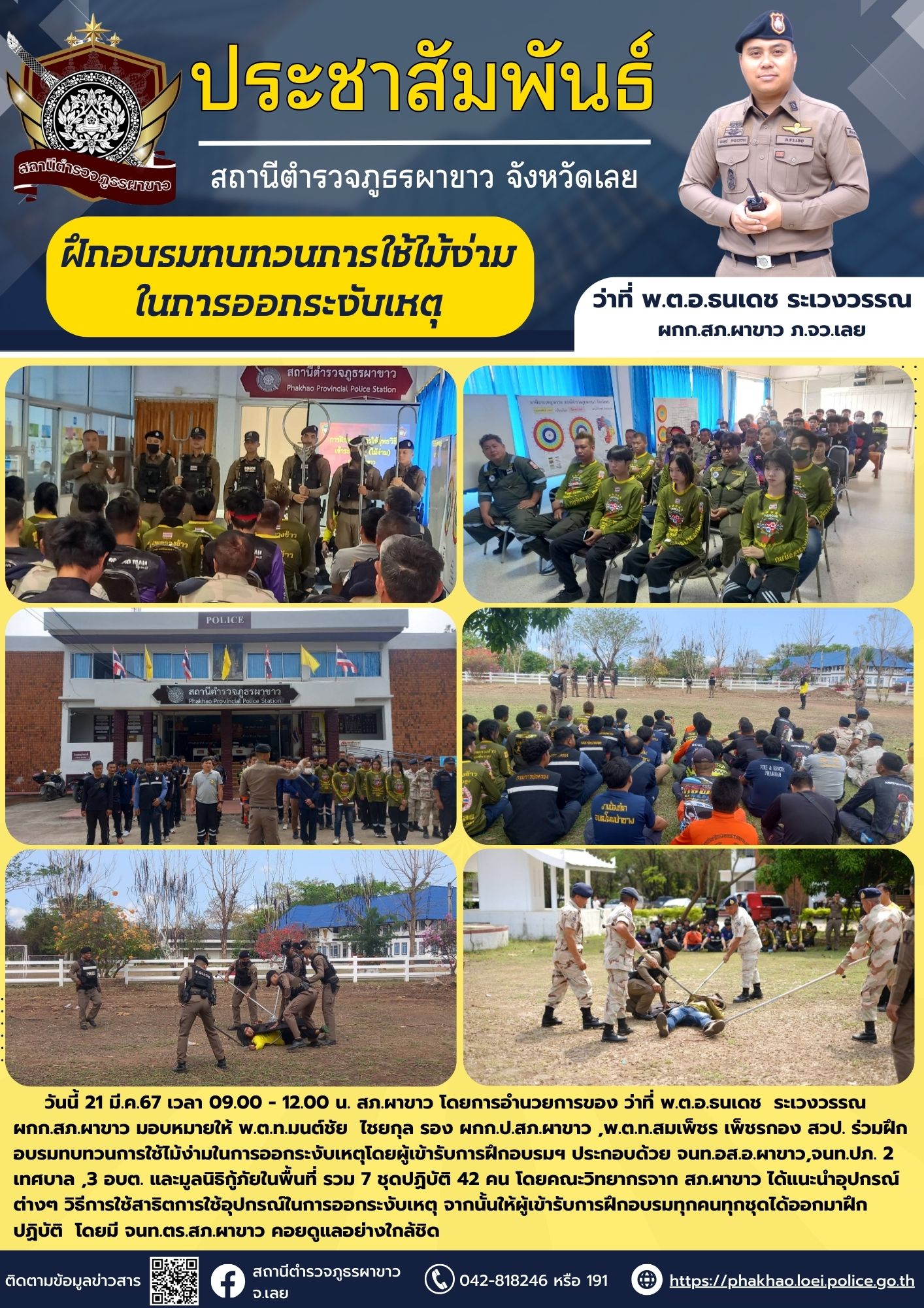 วันนี้ 21 มี.ค.67 เวลา 09.00 – 12.00 น. สภ.ผาขาว โดยการอำนวยการของ ว่าที่ พ.ต.อ.ธนเดช ระเวงวรรณ ผกก.สภ.ผาขาว มอบหมายให้ พ.ต.ท.มนต์ชัย ไชยกุล รอง ผกก.ป.สภ.ผาขาว ,พ.ต.ท.สมเพ็ชร เพ็ชรกอง สวป. ร่วมฝึกอบรมทบทวนการใช้ไม้ง่ามในการออกระงับเหตุโดยผู้เข้ารับการฝึกอบรมฯ