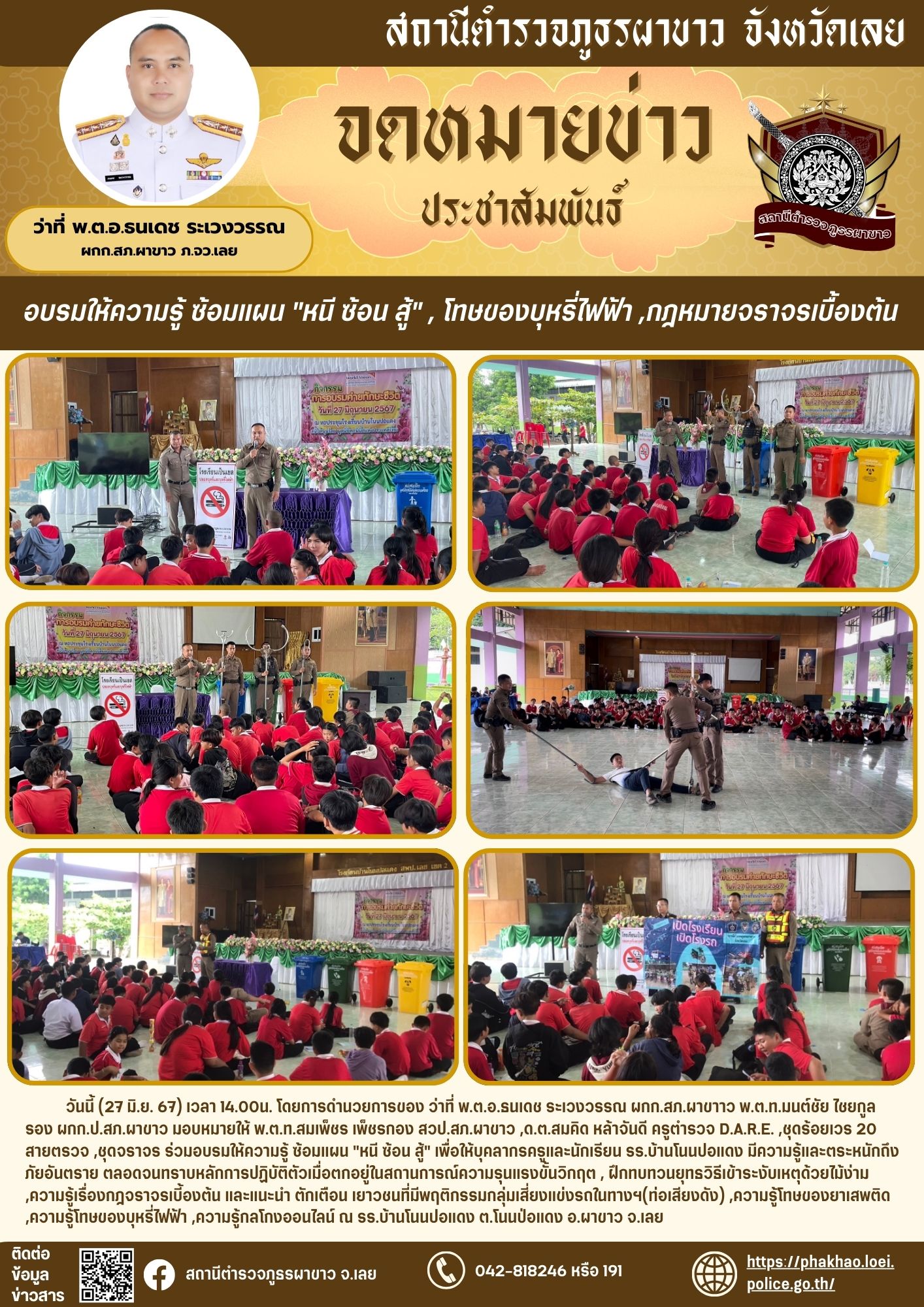 ว่าที่ พ.ต.อ.ธนเดช ระเวงวรรณ ผกก.สภ.ผาขาาว พ.ต.ท.มนต์ชัย ไชยกูล รอง ผกก.ป.สภ.ผาขาว มอบหมายให้ พ.ต.ท.สมเพ็ชร เพ็ชรกอง สวป.สภ.ผาขาว ,ด.ต.สมคิด หล้าจันดี ครูตำรวจ D.A.R.E. ,ชุดร้อยเวร 20 สายตรวจ ,ชุดจราจร ร่วมอบรมให้ความรู้ ซ้อมแผน “หนี ซ้อน สู้”