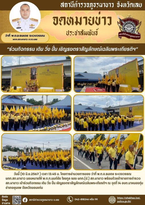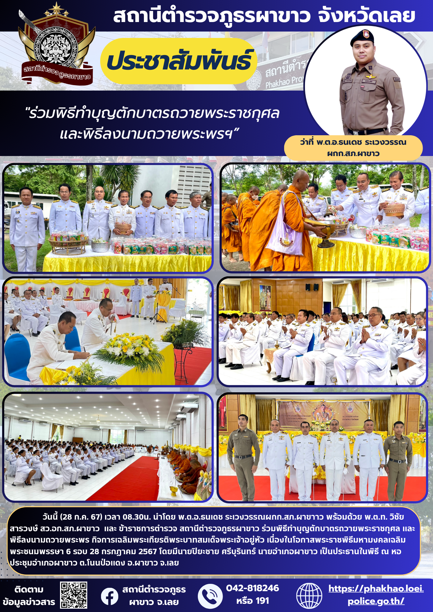 พ.ต.อ.ธนเดช ระเวงวรรณผกก.สภ.ผาขาาว พร้อมด้วย พ.ต.ท. วิชัย สารวงษ์ สว.อก.สภ.ผาขาว และ ข้าราชการตำรวจ สถานีตำรวจภูธรผาขาว ร่วมพิธีทำบุญตักบาตรถวายพระราชกุศล และ พิธีลงนามถวายพระพร กิจการเฉลิมพระเกียรติพระบาทสมเด็จพระเจ้าอยู่หัว เนื่องในโอกาสพระราชพิธีมหามงคลเฉลิมพระชนมพรรษา 6 รอบ 28 กรกฏาคม 2567