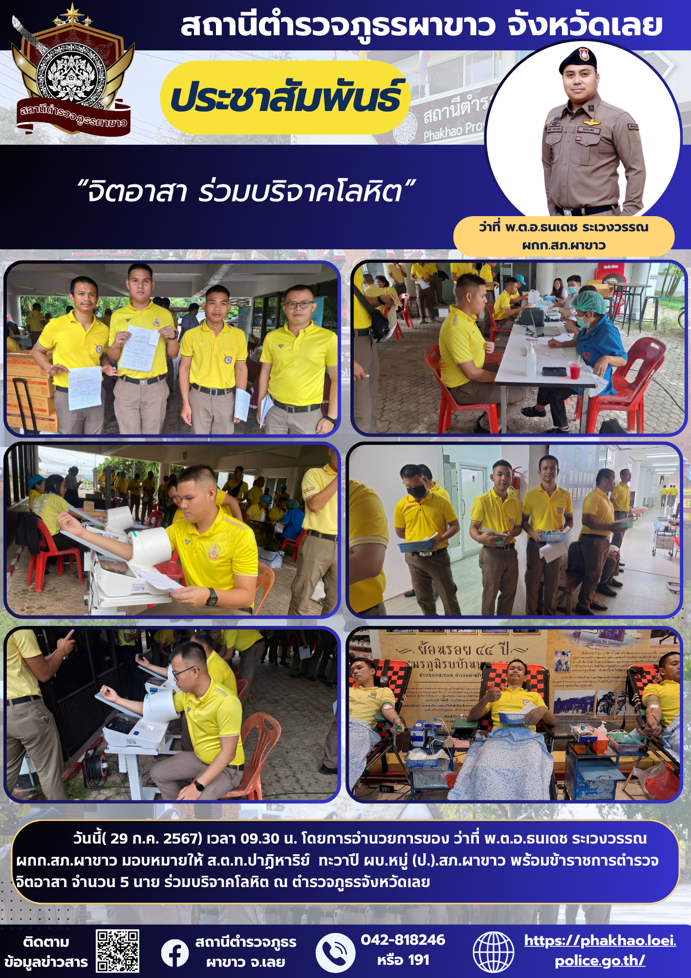 ( 29 ก.ค. 2567) เวลา 09.30 น. โดยการอำนวยการของ ว่าที่ พ.ต.อ.ธนเดช ระเวงวรรณ ผกก.สภ.ผาขาว มอบหมายให้ ส.ต.ท.ปาฏิหาริย์ ทะวาปี ผบ.หมู่ (ป.).สภ.ผาขาว พร้อมข้าราชการตำรวจจิตอาสา จำนวน 5 นาย ร่วมบริจาคโลหิต ณ ตำรวจภูธรจังหวัดเลย