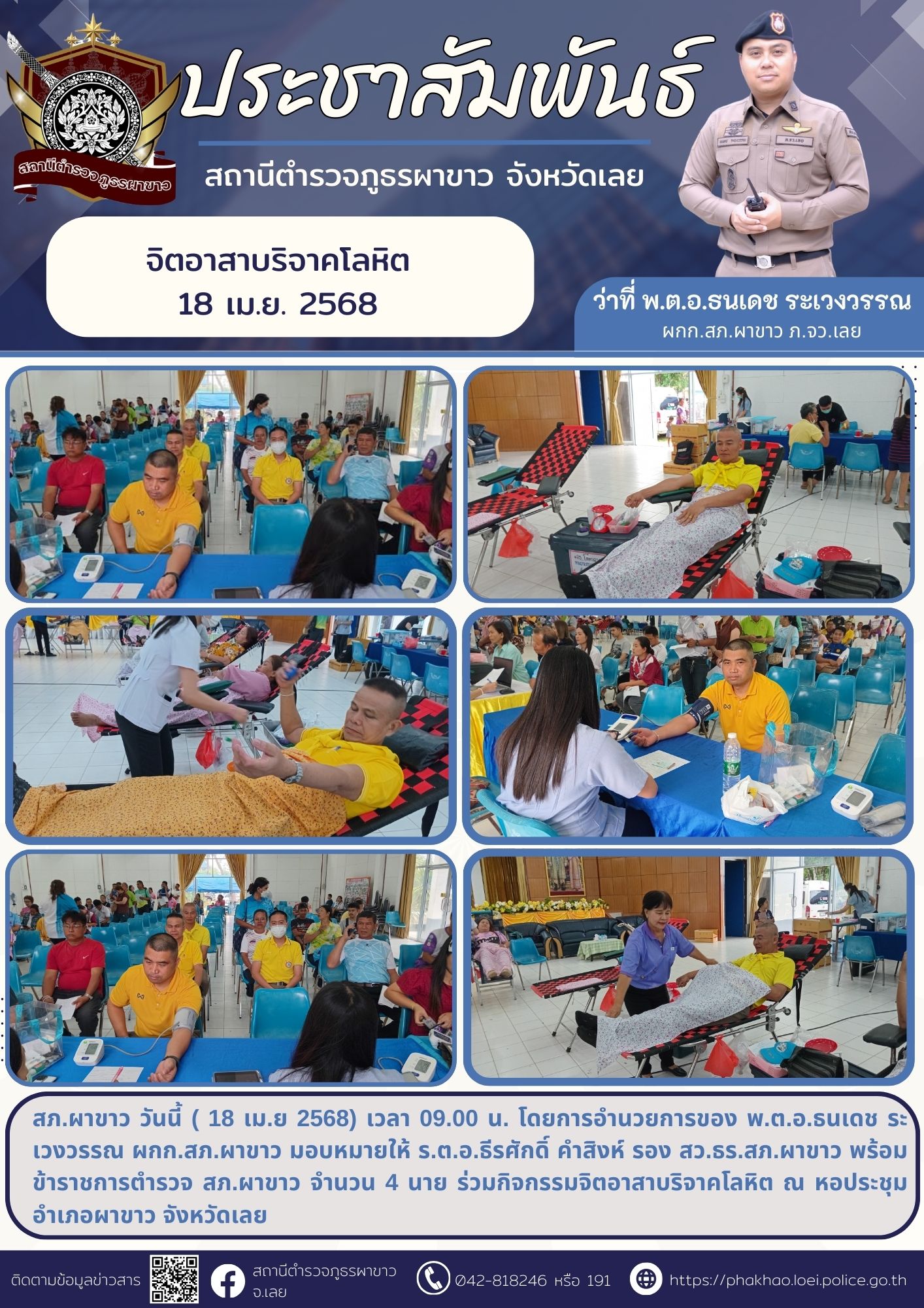 • ข้าราชการตำรวจสถานีตำรวจภูธรผาขาว ร่วมบริจาคโลหิต ณ หอประชุมอำเภอผาขาว