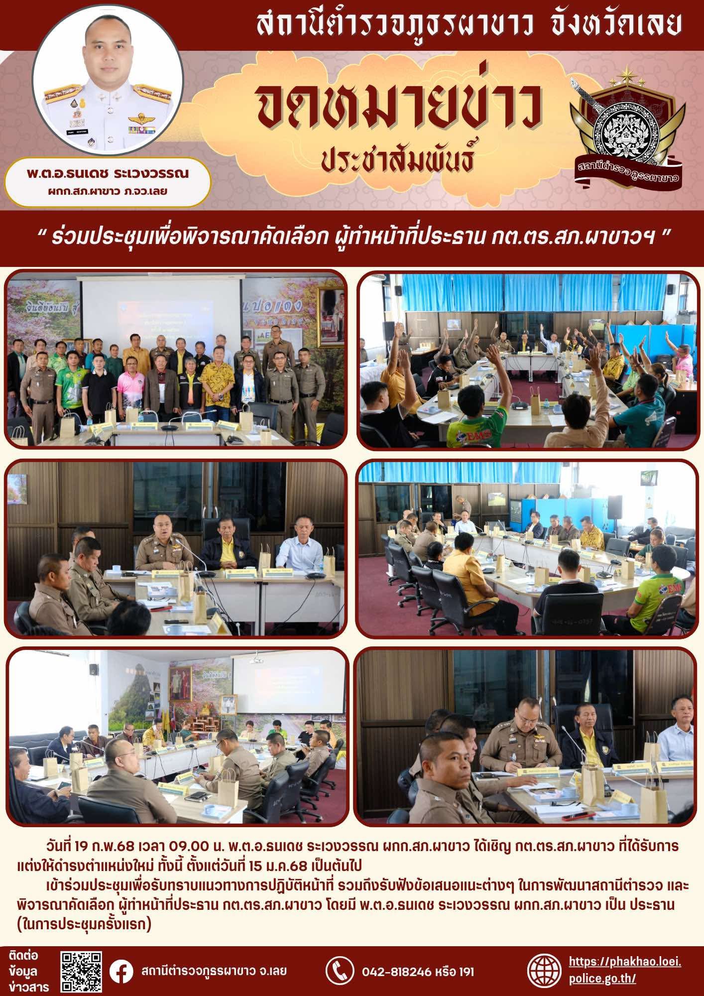 เข้าร่วมประชุมเพื่อรับทราบแนวทางการปฏิบัติหน้าที่ รวมถึงรับฟังข้อเสนอแนะต่างๆ ในการพัฒนาสถานีตำรวจ และพิจารณาคัดเลือก ผู้ทำหน้าที่ประธาน กต.ตร.สภ.ผาขาว โดยมี พ.ต.อ.ธนเดช ระเวงวรรณ ผกก.สภ.ผาขาว เป็น ประธาน (ในการประชุมครั้งแรก)